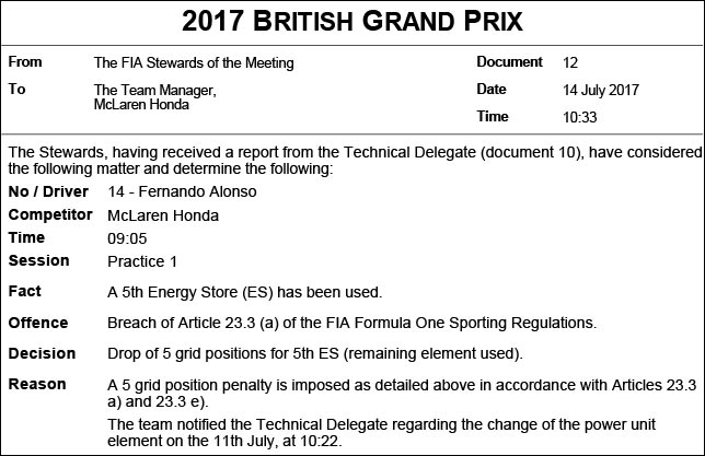Вчера Алонсо говорил о необходимости замены MGU-H на его машине, так что размер штрафа может быть не окончательным.