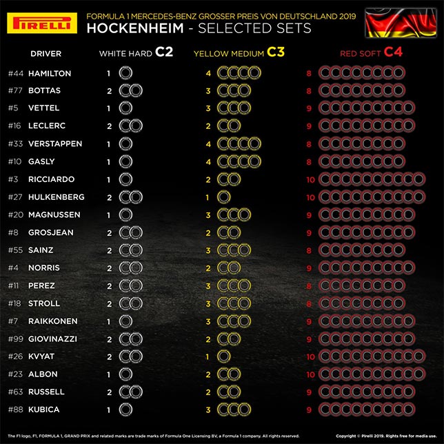 Команды традиционно выбрали больше всего комплектов шин Soft – для работы на тренировках, квалификации и первого отрезка гонки, но и второй комплект Hard, кроме одного обязательного, выбрали сразу 11 гонщиков. По числу комплектов Medium диапазон вновь большой – от одного у Квята и Хюлкенберга до четырёх у Хэмилтона, Ферстаппена и Гасли.