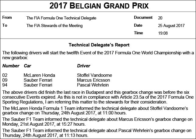В пятницу в FIA подтвердили замену коробки передач на четырёх машинах – у Нико Хюлкенберга, Стоффеля Вандорна, Маркуса Эриксона и Паскаля Верляйна, причём только гонщик Renault не будет наказан, поскольку не финишировал в прошлой гонке, остальных ждёт штраф с потерей пяти мест.