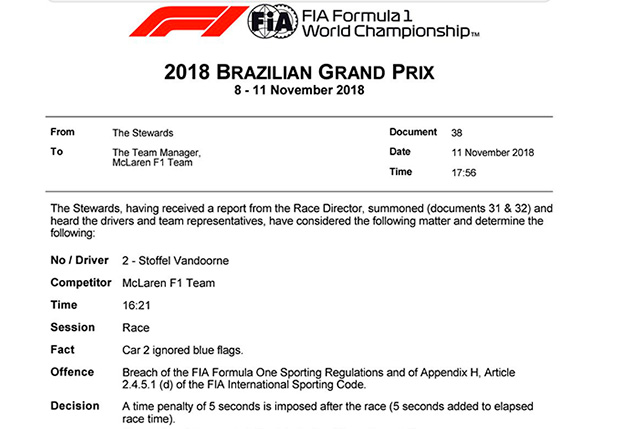 Стюарды Гран При Бразилии наказали пилота McLaren Стоффеля Вандорна – к его результату прибавлено 5 секунд, в результате чего в итоговом протоколе он оказался 15-м, позади Эстебана Окона.