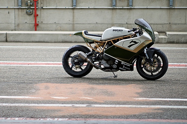 Первоначально кастомайзер приобрел раму от модели 750SS конца девяностых годов потому, что понравился ее внешний вид. А затем ему подвернулся Monster 900 ie 2001 года и пошло-поехало. Двигатель «Монстра», а также его электрооборудование, вилку и тормоза Brembo срастили с рамой. Оперение — модифицированный «слепой» пластик от гоночного 900SS. Топливный бак взят у 750 Sport и переделан. Маятник некогда стоял на 1000SS. Неплохой набор ингредиентов и результат впечатляющий!