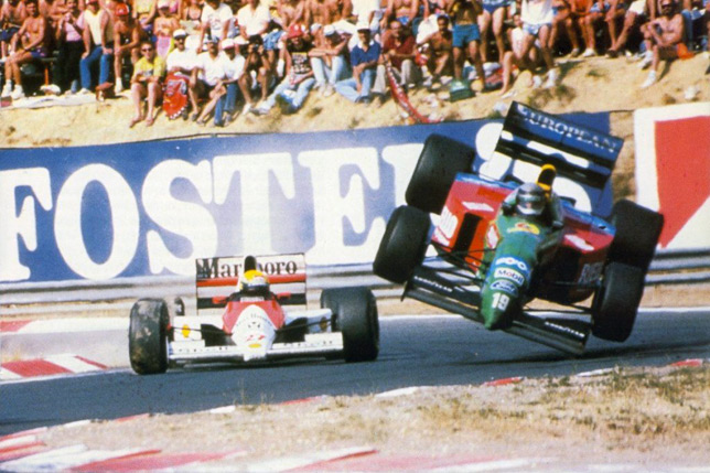 Столь отчаянные сражения на такой узкой трассе редко обходятся без аварий. На 64-м круге Сенна пошёл в отчаянную атаку на Наннини в шикане. Места для двух машин там попросту не было – соперники столкнулись, Benetton Наннини подбросило в воздух, а при приземлении сломалась подвеска. На McLaren Сенны обошлось без повреждений, так что он отправился в погоню за Бутсеном.