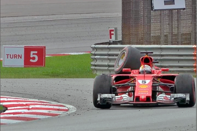 Пресс-служба чемпионата мира опубликовала видеозапись удивительного инцидента, произошедшего на Гран При Малайзии уже после финиша – медленно ехавшие по трассе Лэнс Стролл и Себастьян Феттель не поняли друг друга и столкнулись, да так, что машина Феттеля после этого осталась на трёх колёсах.