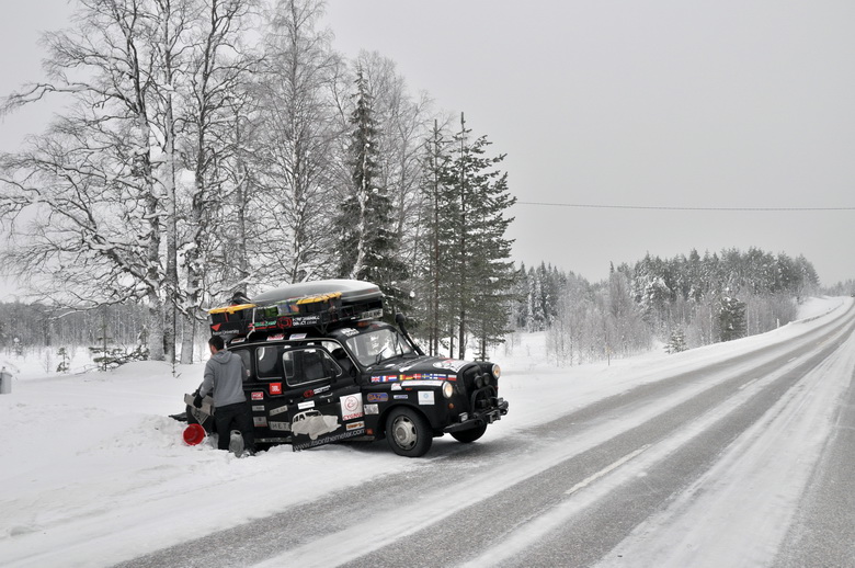 Стартовали, естественно, из Лондона. Первая часть путешествия проходила по отличным европейским дорогам и не представляла сложности. Сначала проехали по Франции, затем через Германию перебрались в Данию, далее в Скандинавию. И тут, оказавшись на покрытых снегом дорогах Швеции, путешественникам срочно отправились на поиски хорошей зимней резины.