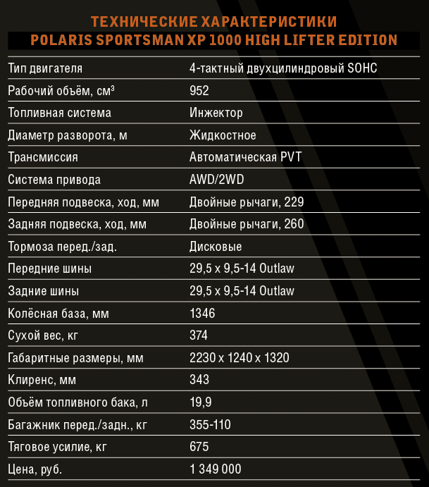 Квадроцикл Sportsman XP 1000 High Lifter Edition первым в сегменте подобных машин получил стабилизатор, облегчающий управление при езде по грязи. На Sportsman High Lifter установлена лебёдка на 2000 кг с переключателем на руле и передние буксировочные крюки. Но выделяют High Lifter, конечно, колёса. Они и шире расставлены, и сами по себе выше, и протектор максимально агрессивный. Второе, на что обращаешь внимание, — изогнутые рычаги подвески. Такая форма применяется ради увеличения артикуляции, а значит, проходимости. Ещё один занимательный нюанс — радиатор перенесён с привычного фронтального места, где он частенько становится жертвой толстой ветки или камня, наверх, под передний багажник. Там он со всех сторон закрыт рамой, а спереди — лебёдкой.