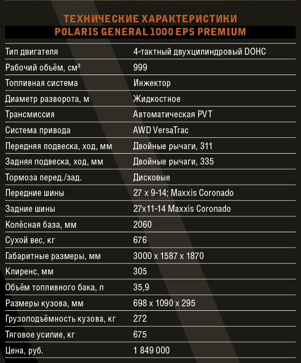 «Удиви меня!» — говорит критик Антуан Эго в мультфильме «Рататуй», заказывая повару-крысе новое блюдо. Я невольно вспомнил эту фразу во время тест-драйва, пересаживаясь с одного мотовездехода Polaris на другой. Если вам, как и мне, когда-нибудь доведётся прокатиться сразу на нескольких из них, мой совет: начинайте с General. Он не считается звездой линейки, но среди большого количества внедорожной мототехники неожиданно удивляет комфортом, основательной хозяйственностью и, не побоюсь этого слова, дружелюбием. Разумеется, его утилитарная направленность весьма условна: как и все вездеходы, General отлично справляется с бездорожьем, обладая при этом самой большой в классе суммарной грузоподъёмностью (500 кг) и грузовой платформой, способной выдерживать до 272 кг. Регулировки двух анатомических сидений позволяют удобно разместиться человеку любого роста и комплекции. От брызг и грязи защищают полудвери, а мелкие вещи можно сложить в герметичный бардачок. Кстати, общий объём полезных отсеков в кабине — 23 литра. Эти литры грамотно распределены по всему пространству, в местах, куда способен дотянуться пристёгнутый водитель. Рулевая колонка ходит вверх-вниз вместе с приборной панелью, на которой собрана вся полезная информация о работе систем сайда.