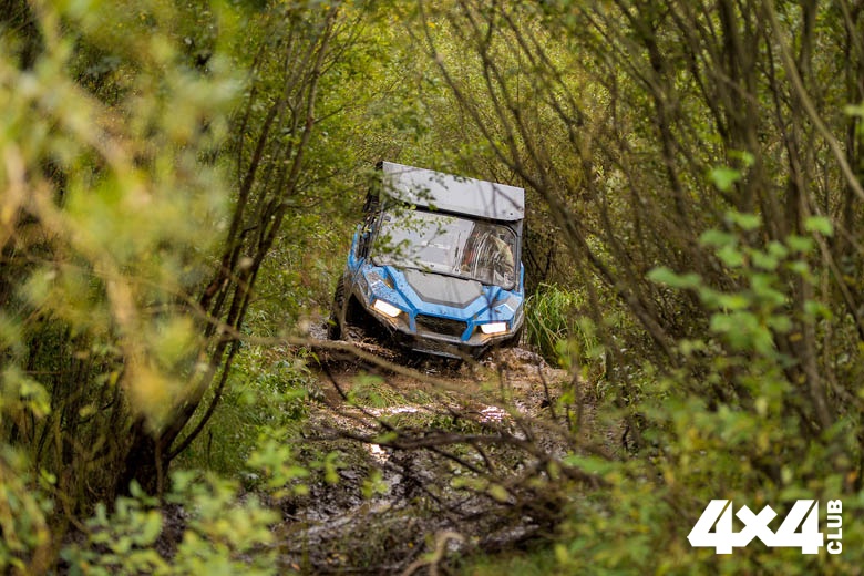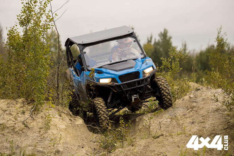Эластичность двигателя позволяет не только очень точно дозировать газ на ходовых препятствиях, но и буквально филигранно переваливать валуны и поваленные деревья с минимальной скоростью. Нельзя не упомянуть шины Maxxis Coronado. С ними все утилитарные наклонности как-то незаметно переходят в спортивные, заставляя водителя быстрее проходить поворот, экспериментировать с подключением и отключением передних колёс и даже прыгать с небольших трамплинов — General вовсе не тихоход и легко подбирается к отметке 100 км/ч. В компании агрессивных соплеменников он не выглядит ни тихоней, ни аутсайдером. Наоборот, рвётся в бой, легко форсируя полуметровой глубины речушки и проламываясь сквозь очень неприятное препятствие — упрямый кустарник на берегу.