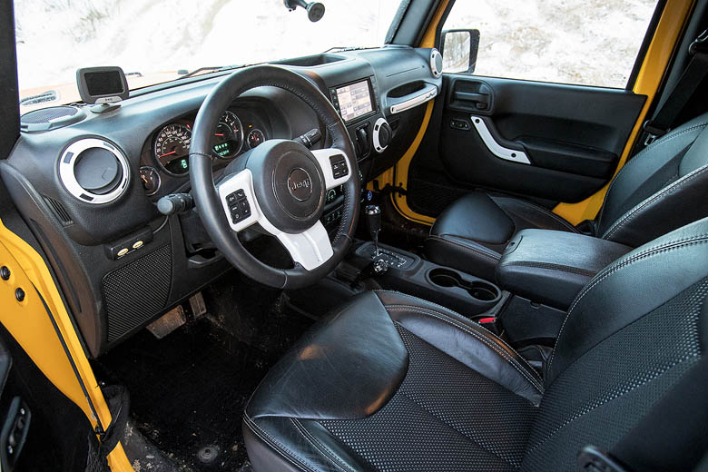 Проходимость мостового внедорожника напрямую зависит от размера колёс. Диаметра в 35 дюймов вполне хватает, чтобы серьёзно повысить его потенциал, сохранив возможность комфортного передвижения по асфальту. Поэтому Wrangler получил покрышки Dick Cepek Fun Country 35/12,5 R17. Это тихая и долговечная резина с протектором All-Terrain и гарантией пробега около 75 тыс. км. Чтобы покрышки поместились в арки, подвеску подняли на те же два дюйма с помощью австралийского лифт-комплекта TJM XGS. В него входят все необходимые компоненты — усиленные амортизаторы и пружины, рулевой демпфер и кастор-кит. Сапуны агрегатов трансмиссии вывели под капот и перешли к наружным работам. Компания Warn — самый крупный производитель лебёдок в мире, но бамперы этой марки мало известны нашим джиперам. Так вот, бамперы серии Elite примерили к кузову и сняли, чтобы подготовить машину к нанесению двухкомпонентного покрытия Z-PRO. Его используют для защиты от коррозии и повреждений товарных вагонов и газовых труб, которые закапывают в землю, так что оранжевую краску с Wrangler можно разве что срубить стамеской. Хотя и в этом случае придётся постараться. Этим же составом покрыли оба бампера. В передний установили быструю лебёдку WARN ZEON10-S Platinum с тяговым усилием 10 000 фунтов (4 536 кг), оснащённую дистанционным управлением с электромагнитным роспуском, контролем заряда аккумулятора, температуры электромотора и другими полезными функциями. Декоративными «ангельскими глазками» в этом случае не ограничились (потому что родной свет, увы, слабоват), использовались дополнительные фары ближнего/дальнего света WARN SDB‑160HBE в металлических корпусах с упрочнёнными стёклами. Калитка на заднем бампере вполне выдерживает тяжёлую запаску и реечный домкрат Hi-Lift Jack, для которого иначе просто не нашлось бы места. Но, пожалуй, главной фишкой стал электропривод матерчатой крыши. Достаточно отстегнуть две мощные защёлки у рамки ветрового стекла, нажать кнопку — и через несколько секунд вы оказываетесь в открытом автомобиле с кузовом типа тарга. И кстати, в отличие от УАЗа дверные проёмы у Jeep велики, чего не скажешь о внутреннем пространстве, по объёму которого отечественный вездеход наголову выше.