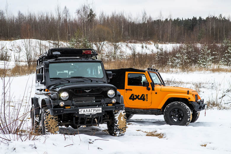 Намесив снега и попрыгав по ухабам, забияки застыли друг против друга. И вдруг в беспросветно хмурый день выглянуло солнце. Как тут не поверить в знак свыше — примирение состоялось! Возвращаясь к делам земным, зададимся вопросом: «А зачем вообще в случае с УАЗом нужен такой серьёзный тюнинг?» Если бы на это существовал однозначный ответ, жизнь не была бы такой интересной. Спорить можно обо всём, включая финансы, рациональность и итоговое удовольствие… Новый «Хантер» стоит примерно 700 тыс. рублей, полная переделка по рецепту «Галагрин» — ещё полтора-два миллиона в зависимости от уровня отделки салона. За Jeep Wrangler JK третьего поколения в возрасте двух-трёх лет просят в среднем 2–2,5 млн. рублей, а Wrangler четвёртого поколения (с 2018 года) обойдётся не меньше чем в 3 400 000 рублей. Комплекс работ в ателье «Клуба 4х4», включая защитное покрытие и мягкий верх с электроприводом, потянет миллиона на полтора. Порядок цен понятен, и суммы в любом случае немаленькие. Обладатель Wrangler получил в результате стильную классическую машину с широчайшими драйверскими возможностями, невероятно комфортную на просёлке, но довольно шумную и тесную. Владелец УАЗа может гордиться не только доведённой до твёрдой пятёрки внешностью внедорожника, но и адекватными ходовыми качествами при вместительном пятиместном кузове. Ну а ангелы, похоже, в тот день удалились выяснять отношения в другое измерение, оставив непонятный им чёрно-оранжевый мир грешным людям, умеющим взлетать на тяжёлых стальных машинах лишь ради того, чтобы потешить собственное самолюбие.