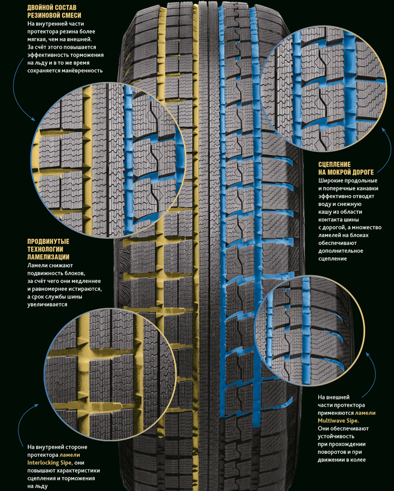 Состав резины внутренней части протектора мягче, чем внешней. За счёт этого повышается эффективность торможения на льду и сохраняется манёвренность.Вместе эти два продвинутых приёма «ламелизации» позволяют участкам одного и того же колеса проявлять разные свойства в разных дорожных условиях, что делает покрышку по-настоящему универсальной.